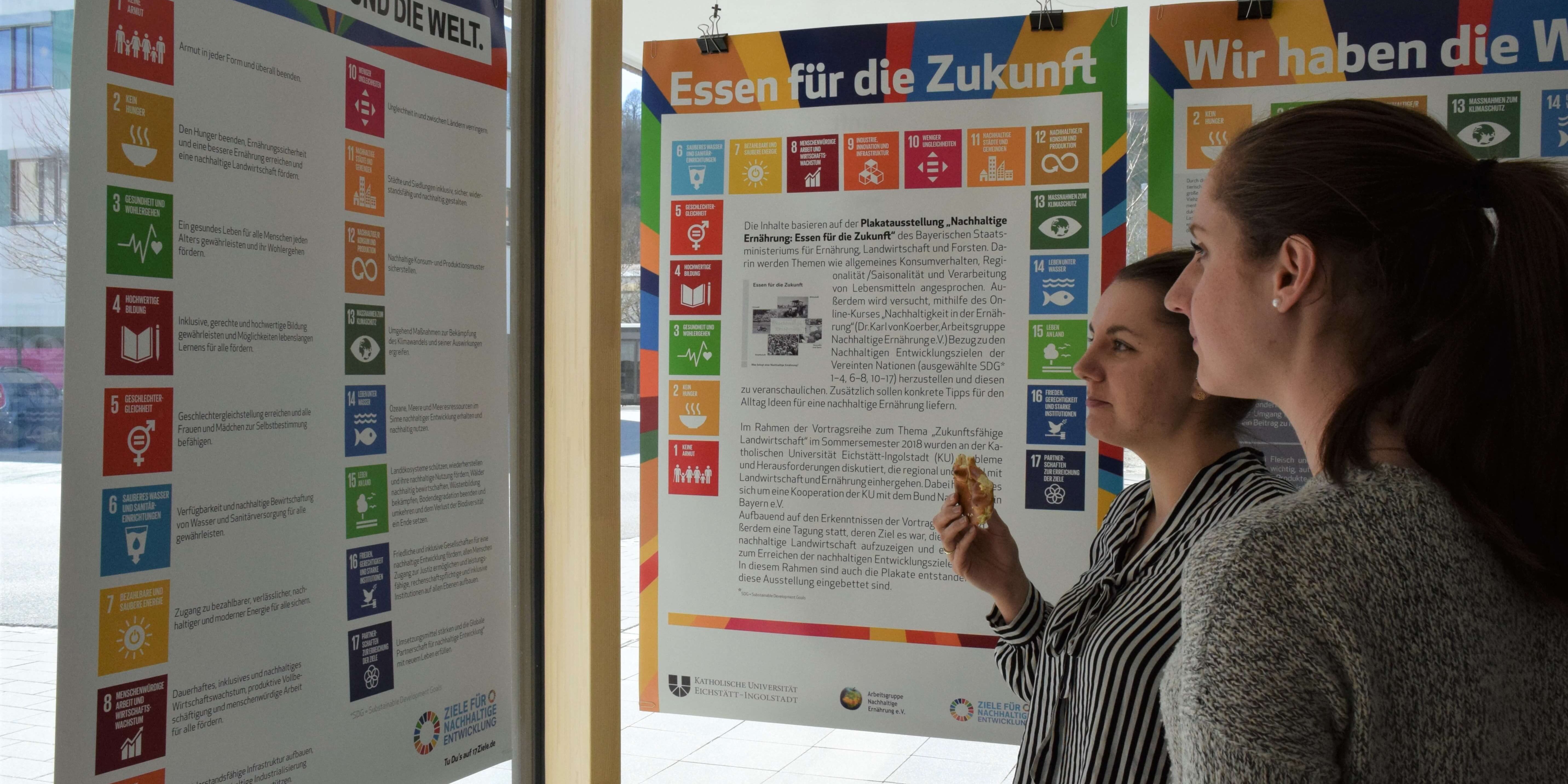 Wer bei der Ausstellung über nachhaltige Ernährung tiefer in das Thema einsteigen möchte, kann buchstäblich hineingehen: Im KU.impact-Büro finden sich auf der Rückseite der Plakate Hintergrundinformationen und weitere praktische Alltagstipps. Dort erfährt man, welche Auswirkungen die Ernährung auf die Umwelt, die soziale Gesellschaft, auf Gesundheit und Genuss und auf faire Wirtschaft hat. Zusätzlich wird der Bezug zu den Zielen für Nachhaltige Entwicklung der Vereinten Nationen (UN Sustainable Development Goals, SDGs) hergestellt. Die Staatengemeinschaft will mithilfe der 17 Ziele die nachhaltige Entwicklung bis 2030 global voranbringen. Ergänzt wird die Ausstellung durch wissenschaftliche Poster aus der Tagung „Zukunftsfähige Landwirtschaft“, die 2018 an der KU stattfand.