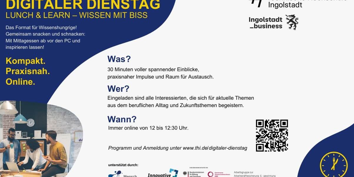 Die Technische Hochschule Ingolstadt (THI) präsentiert gemeinsam mit der Ingolstädter Wirtschaftsförderung (IFG) die Neuauflage des bewährten Online-Formats „Lunch & Learn“. Unter dem Titel „Digitaler Dienstag – Lunch & Learn“ startet ab dem 3. Juni 2025 eine Online-Veranstaltungsreihe speziell für kleine und mittelständische Unternehmen (KMU) aus der Region 10.