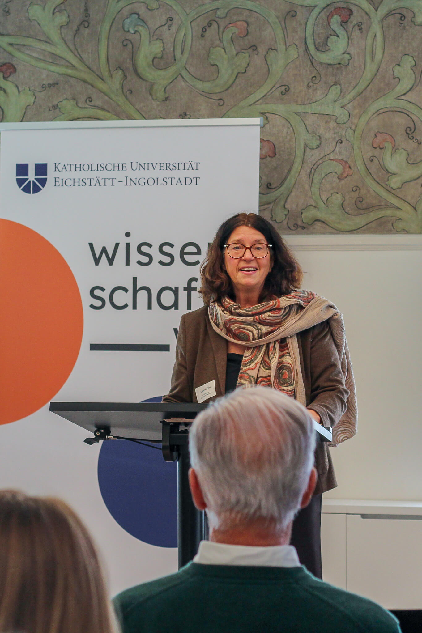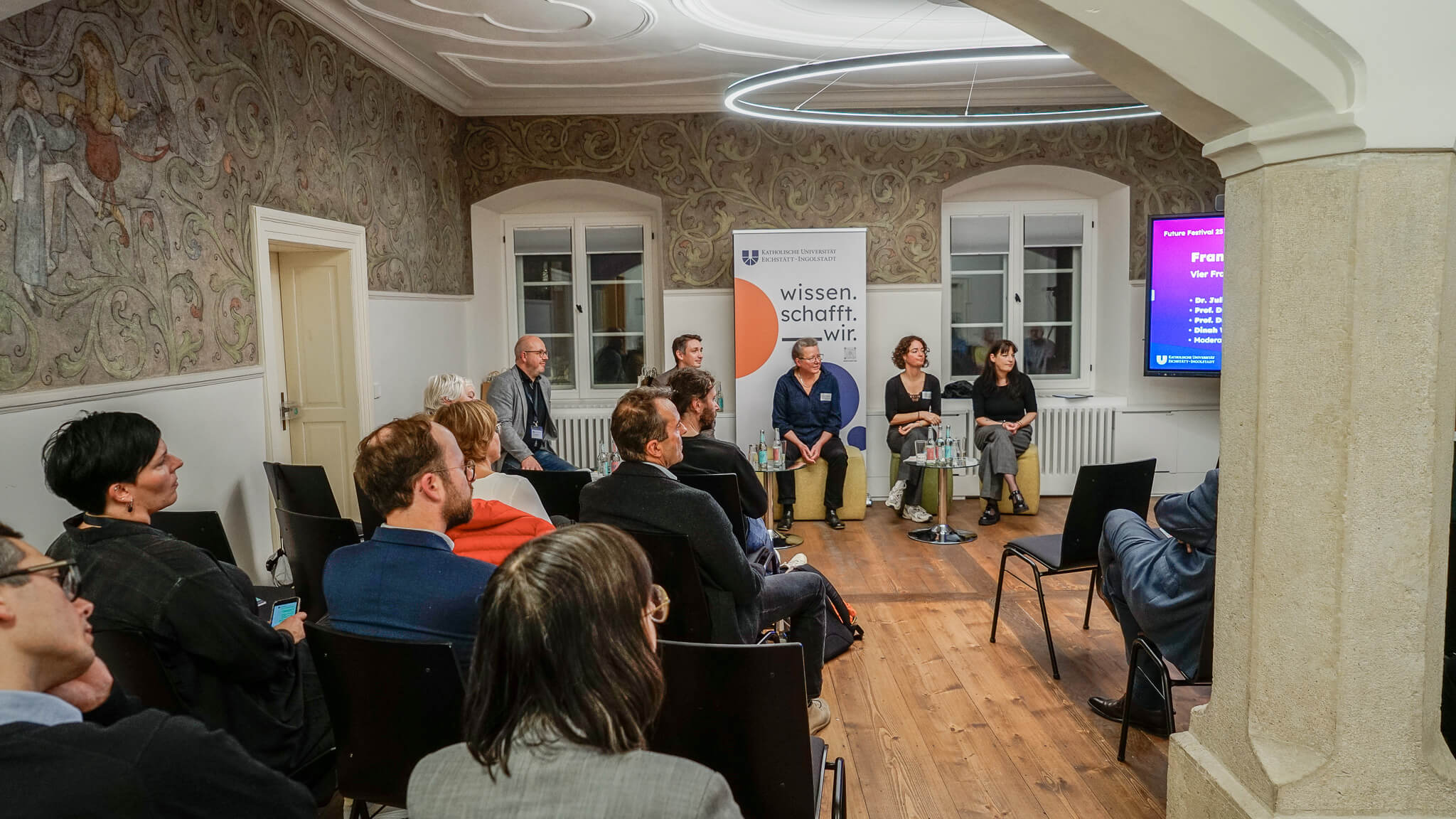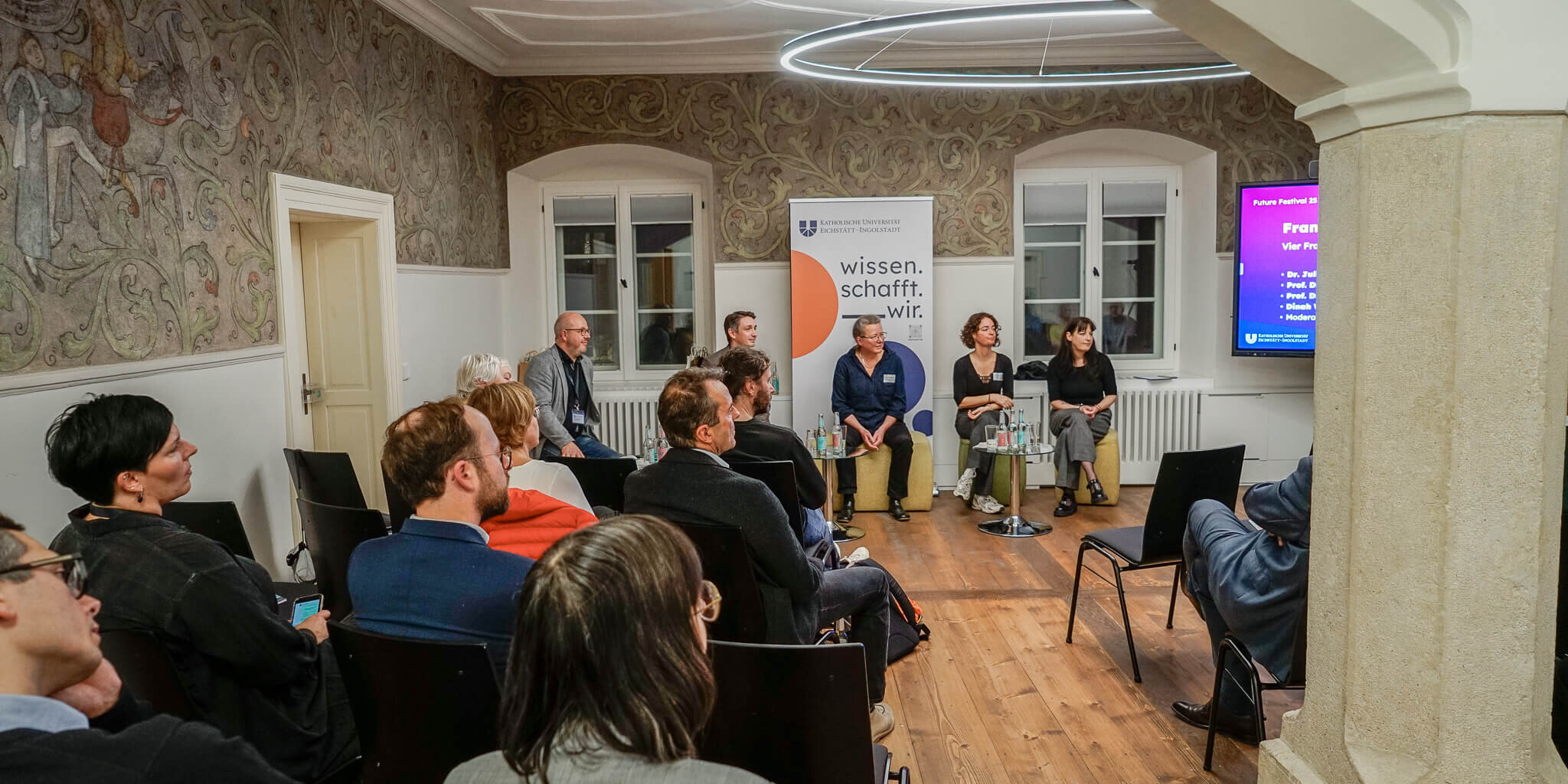 Den Abschluss des Festivals bildete eine Podiumsdiskussion über Mary Shellys Roman „Frankenstein“. Dr. Julia Wiedemann, Literaturwissenschaftlerin an der KU, tauchte in ihrem Eröffnungsvortrag tief in die Entstehung des Romans und seine Charakteristika ein. In der anschließenden Diskussion ging es darum, wie das Potenzial des Romans als Reflexionsrahmen für den Umgang mit aktuellen Herausforderungen genutzt werden kann. Prof. Dr. Norbert Paulo, Professor für Philosophie und Ethik der Digitalisierung, schlug hierbei direkt einen Bogen zu aktuellen Debatten rund um eine verantwortliche Entwicklung Künstlicher Intelligenz. Auch Prof. Dr. Marion Ruisinger, Direktorin des Medizinhistorischen Museum Ingolstadt, betonte: „Forschung überschreitet andauernd Grenzen, eine Einschätzung der Folgen ist daher wichtig.“ Wie eine moderne Adaption des Romans aussehen kann, zeigte Dinah Wiedemann, Dramaturgin am Stadttheater Ingolstadt. Am Stadttheater ist derzeit „Das Jahr ohne Sommer“ zu sehen, ein Stück, das direkt Bezug nimmt auf die Entstehung des Romans im Jahr 1816 und hierbei zugleich das Ringen um eine Welt in der Klimakatastrophe verhandelt.